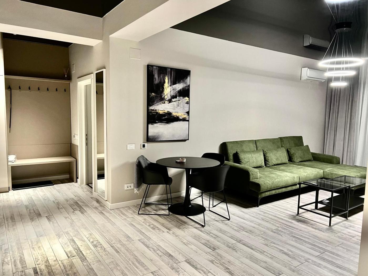 One-Bedroom Premium Apartment. This spacious apartment comes with 1 living room, 1 separate bedroom and 1 bathroom with a shower and free toiletries. Guests can make meals in the kitchen that features a stovetop, a refrigerator, a dishwasher and kitchenware. The air-conditioned apartment features a flat-screen TV with cable channels, a washing machine, a private entrance, soundproof walls as well as garden views. The unit has 2 beds.