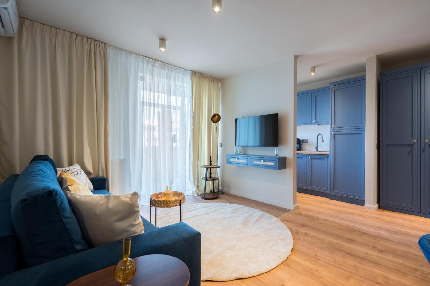 One-Bedroom Apartment. This apartment is comprised of 1 living room, 1 separate bedroom and 1 bathroom with a walk-in shower and free toiletries. Meals can be prepared in the kitchen, which is fitted with a stovetop, a refrigerator, kitchenware and an oven. The air-conditioned apartment offers a flat-screen TV, a washing machine, a tea and coffee maker, a dining area as well as city views. The unit offers 2 beds.
