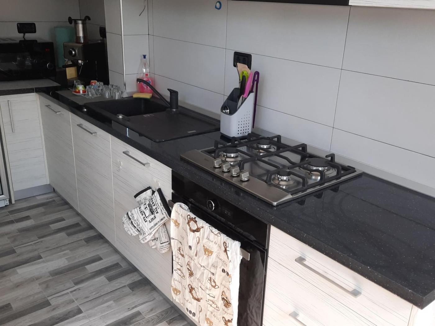 The units come with parquet floors and feature a fully equipped kitchen with a dishwasher, a dining area, a flat-screen TV, and a private bathroom with shower and slippers. An oven, a microwave and fridge are also provided, as well as a coffee machine. At the guest house,units are fitted with bed linen and towels.
